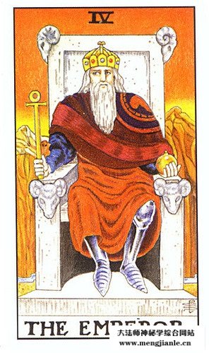 物語三:皇帝具有威權,自我中心,行動力強,對應占星學中的牡羊座,也對應希臘神話中的天神宙斯(Zeus),然而這位皇帝并不一定像宙斯那樣處處風流。皇后象征母親,皇帝則象征父親,父親母親一陰一陽,互補相成。在這里皇帝是傳統的嚴父,與現代新好爸爸迥異。他是教導孩子社會規范與服從精神的人,如果孩子不聽話,他會拿著藤條追打。平常他也是個理性角色,不擅長表達情感。更進一步來說,我們不應只將其視為狹義的「爸爸」,皇帝牌實際上包含廣義的世間「父親形象」。它可以代表任何有權力、克己嚴謹、但缺乏情感交流的領導人物或權威人士。